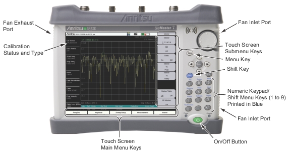 Figure: Site Master Front Panel and Interface Screen. The five bottom menu keys and up to eight submenu keys on the right side of the display are touch screen keys. The menu and submenu keys vary depending on the current operation mode and instrument function selected. Refer to