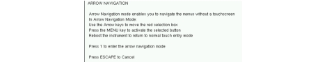 If the touch screen is not functioning, you can use Arrow Navigation to simulate pressing the touch screen main menu keys and submenu keys. From the touch screen calibration message box (see Figure: Touch Screen Calibration Message Box), press 1 to display the arrow navigation message box, illustrated in Figure: Arrow Navigation Message Box. Press 1 again to enter the arrow navigation mode, or press Esc to cancel.