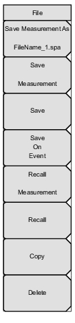 ![]() | Save Measurement As Pressing this key will save instrument setup parameters, trace data, and any measurement results to the file that is named on the submenu key. Upon Save completion, the file name numerical suffix increments by 1 and will be applied to the next Save. The file extension is determined by the current measurement mode, such as .spa for Spectrum Analyzer mode, or .dat for Cable and Antenna Analyzer mode. To save to a different file name than the default shown, or to change the save location, use the Save Measurement or the Save submenu key. Save Measurement Press this submenu key to display the Save Menu and Save dialog box. You can optionally enter a different file name using the keyboard in the Save dialog. You may also select the file type from the drop down list, as illustrated in Figure: Save Dialog Box. The list of available file types varies with the measurement mode. Press Enter to save to the named file and return to the File menu. Pressing Esc exits the Save menu and dialog without saving. The destination file for the saved data may be in the instrument’s internal memory or an external drive, typically a USB drive. To change the save location, refer to the Save Location Menu. Save Press this submenu key to display the Save Menu and Save dialog box. The available settings are the same as those of the Save Measurement key. Save on Event (Not available in all measurement modes) Press this submenu key to display the Save On... Menu. Recall Measurement Press this submenu key to display the Recall Menu. Use this menu to recall measurement files from internal memory or an external drive, such as a USB memory stick. Recall Press this submenu key to display the Recall Menu. The available settings are the same as those of the Recall Measurement key. Use this menu to recall files (such as measurements, setups, limit lines, maps) from internal memory or an external drive. Copy Press this submenu key to display the Copy Menu. Use this menu to copy files and folders. The source and destination locations may be the instrument’s internal memory or an external USB drive. Delete Press this submenu key to display the Delete Menu and a selection box that lists the contents of internal memory and an external drive if connected. Use the rotary knob or the Up/Down arrow keys to scroll to the file that is to be deleted and press the Select or De-Select submenu key, then Delete. Press the Esc key to cancel the operation. Note that deleted files cannot be recovered. |