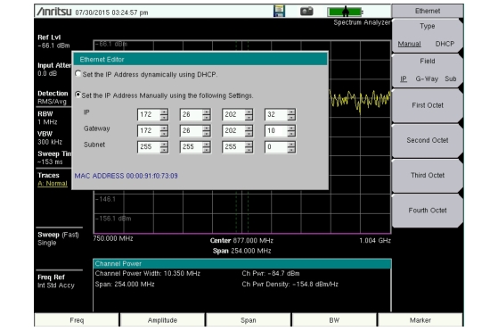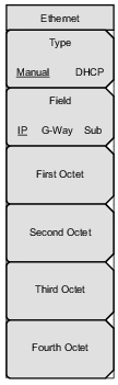 If Manual is selected, use the submenu keys or the Left/Right arrow keys to select the field that is to be modified in the Ethernet Editor dialog. Use the numeric keypad, the Up/Down arrow keys, or the rotary knob to enter the values. Press Enter to apply the changes, or press the Esc key to exit Ethernet Configuration without making changes.