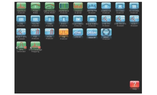The Menu key displays a grid of shortcut icons for installed measurement modes and user-selected menus and setup files. See Figure: Menu Key Screen. Press one of the icons in the top three rows to switch to the corresponding application. These icons are system-generated and cannot be moved or deleted.