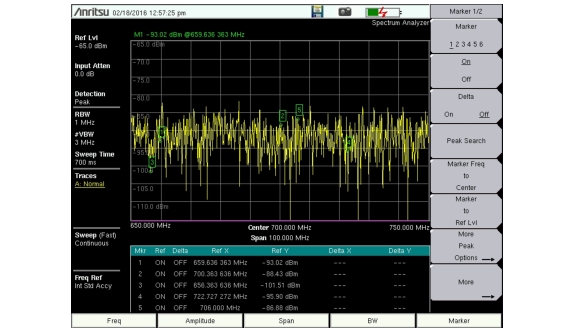 2. Press the Marker Table submenu key so that On is underlined. All marker and delta marker data are displayed in a table under the measurement graph.