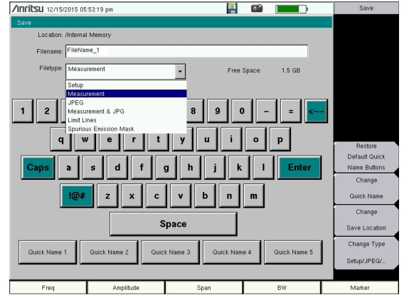 To select the type of data to save, either press the Filetype selection box to display the drop down list of available file types, or press the Change Type submenu key. Selectable file types vary with the measurement mode. Use the Up/Down arrow keys to highlight the desired file type, then press Enter to select.