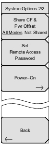 Press this submenu key to toggle the setting between All Modes and Not Shared. Select All Modes to have the current center frequency setting and power offset setting carried over when changing measurement modes. This function is not applicable to measurements that do not have a center frequency or power offset setting or to measurements in which the current center frequency or power offset setting is outside the range of the new measurement.