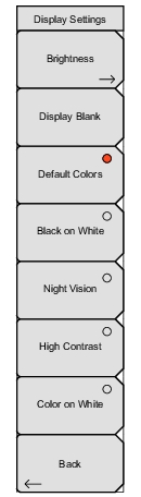 ![]() | Brightness: Opens the Brightness Settings Menu. Display Blank Opens the message box illustrated in Figure: Display Blank Message Box. Press Enter to turn off the display, or press Esc to abort. To turn the display back on, press any key (except the Power button) three times in rapid succession. A power cycle also turns the display back on. Default Colors Sets the display colors to the factory defaults. Used for normal viewing. Black on White Sets the display colors to black on a white background. Used for printing and viewing in broad daylight conditions. See Figure: Spectrum Master Display Color Settings for illustrations of the display color schemes selectable in this submenu. Night Vision Sets the display to a red-tinted color on a black background. The front panel keypad is backlighted in red. This setting is optimized for nighttime viewing. High Contrast: Increases the black and white contrast of the default display. This setting is used in challenging viewing conditions. Color on White Sets the display background to white, the grid to gray, and leaves sweep data in color. This setting is used for printing and viewing in broad daylight conditions. Back Press this submenu key to return to the System Options Menu. |