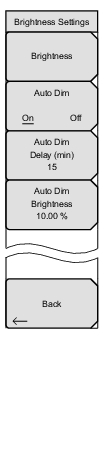 ![]() | The brightness of the display can be adjusted to optimize viewing under a wide variety of lighting conditions. Brightness: Press this submenu key to open the Brightness Editor window, where you can adjust the display brightness level from 0 to 100, with 100 being the brightest. See Figure: Brightness Editor Input Box. Use the rotary knob to adjust the value in increments of 5, or press the Up/Down arrow keys to change the value in increments of 25. Press the Left or the Right arrow key to jump to 0 or 100, respectively. Press Enter to accept the change. All display elements on the instrument screen are affected by the Brightness setting. Auto Dim On/Off Press this submenu key to toggle the display auto-dimming feature on and off. Enabling auto-dim can extend battery life. Auto Dim Delay Press this key to adjust the amount of idle time, from 1 to 15 minutes, before the instrument display goes dim. Use the arrow keys or the rotary knob to adjust the value in increments of 1. You can also use the numeric keypad, then press Enter. Out-of-range values are ignored. Auto Dim Brightness Press this submenu key to select the brightness percentage level of the display when it is dimmed. Use the arrow keys or the rotary knob to adjust the value in increments of 5%, from 0% to 25%. You can also use the numeric keypad, then press % or the Enter key. Out-of-range values are ignored. Back Press this submenu key to return to the Display Settings Menu. |