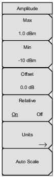 ![]() | Max Sets the maximum value on the display. Min Sets the minimum value on the display. Offset Used to set the division offset. When active, each division value is increased or decreased by the offset entered. A value up to ± 100 dB can be entered. Relative On Off Press this submenu key to toggle relative power On or Off. This measurement shows the relative level of the desired base power level input to your instrument. When ON, the message Relative: On nnn dB (where nnn dB is the current relative value) shows in the message area. The units will be automatically reverted to dBm if necessary. Units Opens the Units Menu. Note that changing the units sets Relative to Off. Autoscale Adjusts the Top and Bottom values so that the power meter needle will be shown in the middle of the analog display. |