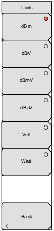 ![]() | Units Select a unit of measure for the power meter. dBm, dBV, dBmV, dBμV, Volt, or Watt. The selected unit is indicated by the red circle. Back Returns to the Amplitude Menu. |