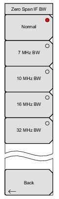 You can select Normal or any one of four fixed IF bandwidths of 7 MHz, 10 MHz, 16 MHz, or 32 MHz. In Normal, the bandwidth is set by the spectrum analyzer RBW selection (BW > Zero Span RBW). When Normal is selected, the IF bandwidth is influenced by the selection of RBW filters, although the digital RBW filters themselves are not employed.
