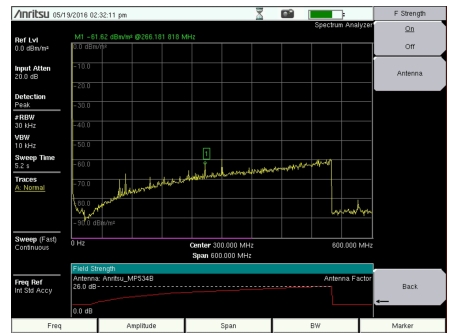 When the Field Strength measurement is enabled, an additional plot is shown at the bottom of the display indicating the selected antenna factor over the currently set frequency span. The field strength measurement is automatically adjusted for this antenna factor.
