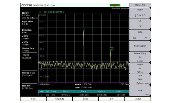 8. Press the On/Off\ delta marker, press the Delta submenu key so that On is underlined. Use the arrow keys or rotary knob to move the delta marker to the desired frequency and press Enter.