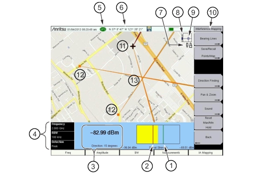 With a valid GPS signal, the instrument is able to make interference mapping measurements even when an Anritsu easyMap Tools file of the current location is not available. Location, signal strength, and bearing information can be saved in a (.kml) file. Details of each time the Save Current Bearing Location & Direction submenu key was pressed can be viewed at a later time on the instrument or in Google Earth. Refer to Mapping Save/Recall Menu for additional information on recalling saved maps and .kml data.