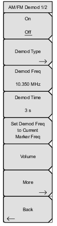 ![]() | On/Off Turns AM/FM Demodulation on or off. Demod Type Provides submenu keys to select the type of signal to be demodulated (refer to Demod Type Menu): FM Wide Band FM Narrow Band AM USB LSB Demod Freq Use the keypad, directional arrow keys, or the rotary knob to enter the center frequency of the signal to be demodulated. When using the numeric keypad, press a unit key or press Enter for values in MHz. This frequency does not have to be within the current frequency sweep range to which the instrument is set. Demod Time Use the keypad, directional arrow keys, or the rotary knob to increase or decrease the demodulation time, and press the Enter key to select. The demodulation time can be set from 100 milliseconds to 500 seconds. The instrument sweeps one time for every demodulation period. Sweeping pauses during the demodulation time. Set Demod Freq to Current Marker Freq Sets the demodulation frequency to the frequency of the current marker. Volume The current volume setting is displayed on the screen. Use the up or down arrow keys or rotary knob to change the volume, and press the Enter key to select. More Opens the AM/FM Demod 2/2 Menu. Back Returns to the [Spectrum] Measure Menu. |