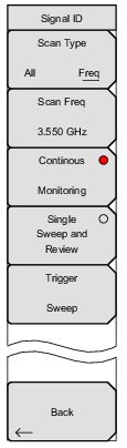Scan Type The Signal ID feature in the Interference Analyzer can help to quickly identify types of the interfering signals. All: Identifies all frequencies within the designated span. Freq: Displays the signal data for the selected scan frequency in the Signal ID Results window. Scan Freq Press this submenu key to enter a desired center frequency for monitoring. Continuous Monitoring Press this submenu key to continuously sweep across the start and stop frequencies, entered frequency span, or scan frequency. Single Sweep and Review Initially places the Signal ID feature in single sweep mode while making a single sweep for review. For subsequent individual sweeps, press the Trigger Sweep submenu key. Trigger Sweep Press this submenu key to trigger another sweep when the Single Sweep and Review submenu key is activated. Back |