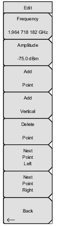 ![]() | Add Vertical In many measurement masks, step changes occur in the value of the limit line. Press this submenu key to add two inflection points. The two inflection points share the same frequency and are centered midpoint between adjacent measured points. The magnitudes of the points are set by using a visually intuitive algorithm that is based upon the adjacent inflection points. You can adjust the magnitudes independently, but the frequencies of the two points remain linked and are adjusted as a vertical pair. Setting a discrete frequency, a limit inflection point will keep that exact frequency and place the limit point appropriately regardless of the frequency span. This is especially useful for emission mask verification. Delete Point Press this submenu key to delete the currently active point. The active point becomes the point that is immediately to the left of the point that was deleted. Next Point Left Press this submenu key to select the inflection point that is immediately to the left of the active point, making this newly selected point active for editing or deletion. With each key press, the active point becomes that point to the left of the previously active point, until the newly selected active point becomes the left‑most point on the screen. Next Point Right Press this submenu key to select the limit point immediately to the right of the active point, making this newly selected point active for editing or deletion. With each key press, the active point becomes that point to the right of the previously active point, until the newly selected active point becomes the right‑most point on the screen. Back Press this submenu key to return to the Limit Menu. |