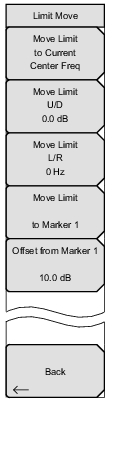 ![]() | Move Limit to Current Center Freq Pressing this submenu key moves the center of the existing limit line to the center frequency of the measurement. The span of the existing limit line is not changed by doing this. Use this submenu key as an easy way to get an existing limit line on screen. If no limit line is turned on, then a new, flat default limit line is turned on and is located 2.5 grid lines from the top of the screen for the upper limit line or 2.5 grid lines from the bottom of the screen for the lower limit line. Move Limit ## dB If the limit line is flat, then use this submenu key to move the limit line to an absolute power point in dBm. If the limit line is not flat, then use this submenu key to move the limit line up or down by the selected number of dB. Use the keyboard to enter the desired value. The entire line moves by the amount that is entered. The limit line can also be moved by using the rotary knob. Turn the rotary knob clockwise to move the line to higher power levels. The up and down arrows move the limit line by 5% of the screen height. The left and right arrows move the limit line by 0.2% of the screen height or 0.2 dB when the scale is set to 10 dB/division. Move Limit ## Hz Pressing this submenu key allows you to adjust the frequencies of the limit line. All inflection points are moved by the value entered. The rotary knob can also be used to make this adjustment. Turn the rotary knob clockwise to move the limit line to higher frequencies. The left or right arrows move the limit line by 5% of the span while the up or down arrows move the line by one display pixel. Move Limit to Marker 1 Press this submenu key to move the frequency and amplitude of the center frequency of the limit line to the frequency and amplitude of Marker 1 (assuming that the Offset from Marker 1 submenu key is set to 0 dB). Offset from Marker 1 ## dB Press this submenu key to set a limit line offset value from Marker 1 amplitude. This feature moves the limit line amplitude and frequency as needed to place the center of the limit line the user‑specified number of dB from the position of Marker 1. Positive values place the limit line above Marker 1, and negative values place the limit line below Marker 1. Back Press this submenu key to return to the Limit Menu. |