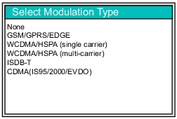 ![]() | Press the submenu key for the desired measurement parameter. Then press the Back submenu key. Average Press this submenu key to have the sensor measure the average power in the forward direction. Crest Factor Press this submenu key to have the sensor measure the Crest Factor in the forward direction. Crest Factor is a ratio of peak power to average power. Burst Average Manual Press this submenu key to have the sensor measure the average power within the signal bursts (in the forward direction). In manual, you must define the duty cycle of the bursts in order to complete the averaging calculation. Refer to the Duty Cycle submenu key in the Limits Menu. Peak Envelope Power Press this submenu key to have the sensor measure the peak power in the forward direction. CCDF Press this submenu key to have the sensor measure the value of the Complementary Cumulative Distribution Function (CCDF). A Cumulative Distribution Function (CDF) describes the probability that the signal power is less than or equal to a threshold value. The Complementary Cumulative Distribution Function (CCDF) describes the probability that the signal power is greater than a threshold value. For directions to set the threshold, refer to the CCDF Threshold submenu key in the Limits Menu. Burst Average Auto Press this submenu key to have the sensor measure the average power within the signal bursts (in the forward direction). In auto, the sensor determines the duty cycle of the bursts in order to complete the averaging calculation. Modulation Press this submenu key to select the modulation type for Peak Envelope Power (PEP) measurement only. First press the Peak Envelope Power submenu key (or check to ensure that the circle on its key face is red). Then press Modulation. The Select Modulation type list box is displayed. Use the arrow keys or the rotary knob to highlight the desired modulation type, and then press Enter to select. The selection of a specific modulation type provides a correction factor to refine the PEP calculation. Refer to Figure: Example Modulation Types for Peak Envelope Power (PEP). Back Press this submenu key to return to the Display menu. |