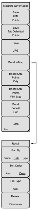 ![]() | Save KML Points Press this submenu key to save the KML points. FileName.kml will be stored in the default save location. From the File menu, press Save, then Change Save Location to change the default location. The Filetype setting includes: KML 2D, KML 3D, Mapping Tab Delimited, and JPEG. Refer to Save the Coverage Mapping Information. Save Tab Delimited Points Press this submenu key to save the points in a tab delimited text file. FileName.mtd will be stored in the default location. Save JPG Press the Save JPG key to save a JPEG file of the current screen. Recall a Map Opens the Recall submenu (shown at the bottom left of this page) for selecting a map to display on the screen. The default map type is AZM. Press the File Type submenu key to select a different map type to recall. Recall KML Points Only Opens the Recall submenu for selecting a KML file. Displays the saved locations overlaid on the current map or the default grid. Recall KML Points With Map Opens the Recall submenu for selecting a KML file. The map that was used when the points were saved will be recalled if it is available. Recall Default Grid If you do not have a GPS embedded map but are out in the field making measurements, the Recall Default Grid submenu allows you to save points and the corresponding GPS coordinates (or screen coordinates for indoor maps) to view at a later time. You can also load the map after acquiring points, or switch maps at any time without losing data. Back |