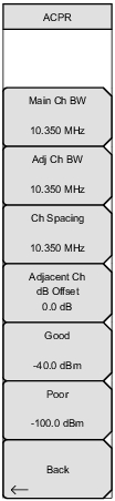Main Ch BW Sets the bandwidth of the main channel for ACPR measurement. Use the keypad, the directional arrow keys, or the rotary knob to enter a specific frequency. When using the keypad, press the GHz, MHz, kHz, or Hz submenu key to accept the frequency input. Changing this value automatically changes the adjacent channel bandwidth and channel spacing. Adj Ch BW Sets the bandwidth of the adjacent channels for ACPR measurement. Use the keypad, the directional arrow keys, or the rotary knob to enter a specific frequency. When using the keypad, press the GHz, MHz, kHz, or Hz submenu key to accept the frequency input. Ch Spacing Sets the channel spacing between the main and adjacent channels. Use the keypad, the directional arrow keys, or the rotary knob to enter a specific frequency. When using the keypad, press the GHz, MHz, kHz, or Hz submenu key to accept the frequency input. This value must be greater than or equal to half of the main channel bandwidth, plus half of the adjacent channel bandwidth. The up or down arrows change the frequency by the frequency step size entered in the Freq (Frequency) Menu. The left or right arrow keys change the value by 10% of the span. Adjacent Ch dB Offset Sets the power ratio offset of the adjacent channels for ACPR measurement. The entered offset value determines the color of the lower and upper adjacent channels in the lower part of the display. If the ACPR value is larger (more positive) than the threshold, the box is green, otherwise, it is red. Good and Poor These submenu keys are used to set the color values for the recorded power during data collection. The colors of the boxes in the lower part of the display, dots on the screen, and .kml pins change based on the measured values. Green: Measurement > Good Yellow: Poor < Measurement ≤ Good Red: Measurement ≤ Poor Back |
