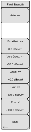 ![]() | Refer to Field Strength for related information. Antenna - Filter the antenna list by favorites or EMI antennas - select and deselect antennas as a favorite, and save the favorites list - navigate the antenna list pages Excellent to Poor These submenu keys are used to set the color values for the recorded field strength during data collection. The bar graph in the lower part of the display indicates measured power density within the range settings of Excellent to Poor; the color of the measured Field Strength box, dots on the screen, and .kml pins change based on the measured value. Dark Green: Measurement ≥ Excellent Light Green: Measurement ≥ Very Good Yellow: Measurement ≥ Good Orange: Measurement ≥ Fair Red: Measurement ≤ Poor Back |