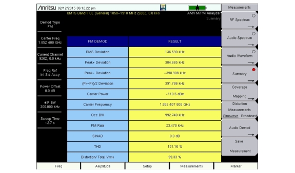 10. From the Measurements menu, press the Audio Demod submenu key to listen to the audio component of the FM signal. In this menu, you can choose wideband or narrowband demodulation, set the demodulation time, and you can also set the instrument speaker volume.