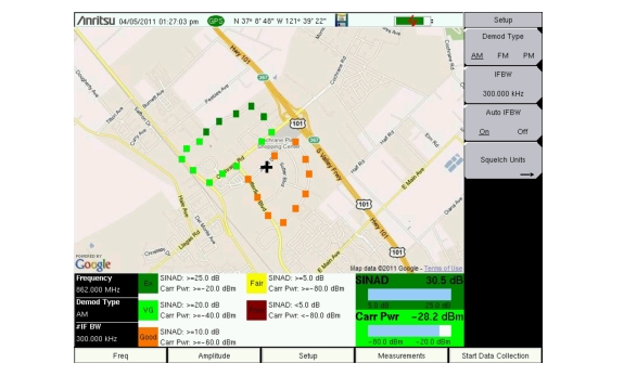 12. For instruments that also have Option 431 installed, press the Coverage Mapping submenu key to set up mapping of Signal‑to‑Noise and Distortion (SINAD) ratio and/or Carrier Power. Refer to Figure: Mapping of AM Signal SINAD and Carrier Power. for an example of coverage mapping. After coverage mapping is turned on, press Measurement Setup to select SINAD and/or Carrier Power and set the threshold levels.