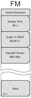 Press to set the sweep time for the FM audio waveform display. If you use the numeric keypad to enter a value, then the submenu keys change to Time in units of min, s, ms, or µs. The output turns On at the level that has been set with the Output Power submenu key. The current state (Off or On) is underlined.