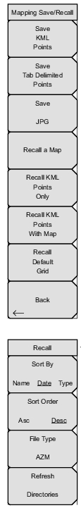 ![]() | Save KML Points Press this button to save the KML points. FileName.kml will be stored in the selected location. From the File menu, press Save then Change Save Location to change the default location. Save Tab Delimited Points Press this button to save the points in a tab delimited text file. FileName.mtd will be stored in the selected location. Save JPG Press the Save JPG key to save a .jpg file of the current screen. Recall a Map Opens the Recall submenu (shown at the bottom left of this page) for selecting a map to display on the screen. The default map type is .azm. Press the File Type submenu key to select a different map type to recall. Recall KML Points Only Opens the Recall menu for selecting a .kml file. Displays the saved locations overlaid on the current map or the default grid. Recall KML Points With Map Opens the Recall menu for selecting a .kml file. The map that was used when the points were saved will be recalled if it is available. Recall Default Grid If you do not have a GPS embedded map but are out in the field making measurements, the Recall Default Grid submenu allows you to save points and the corresponding GPS coordinates (or screen coordinates for indoor maps) to view at a later time. You can also load the map after acquiring points, or switch maps at any time without losing data. Back |