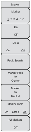 Press to turn On or Off the marker table, which is displayed below the sweep window (Large is not functional in AM/FM/PM mode). The table is automatically sized to display all markers that are turned on. In addition to the marker frequency and amplitude, the table also shows delta frequencies and delta amplitudes for all markers that have deltas entered for them. The current setting is underlined on the submenu key.