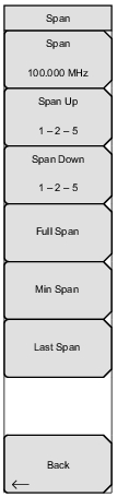 ![]() | Span Sets the width of the measurement window in GHz, MHz, kHz, or Hz. The center frequency and span are displayed in the message area at the bottom of the status window. The span can be entered with the keypad and then selecting a units (GHz, MHz, kHz, or Hz) submenu key, or by using the arrow keys to change an already selected frequency. Press Enter to set the span, or press Esc to restore the previous span setting. Span Up 1 – 2 – 5 Increases the span to the next multiple of 1, 2, or 5. Span Down 1 – 2 – 5 Decreases the span to the next multiple of 1, 2, or 5. Full Span Sets the span to 100 MHz on the current center frequency. Adjusts the center frequency if it is at the edge of the limit of the instrument. Min Span Changes the span to 1 kHz. Last Span Returns the span to the previous value. Back Returns to the Freq (Frequency) Menu. |