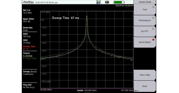 Several sweep modes are available on the instrument. Press the Sweep Mode submenu keys to select between Fast (default), Performance, No FFT, or Burst Detect. Note that Burst Detect is supported on MS2720T and MT8220T instrument models only.