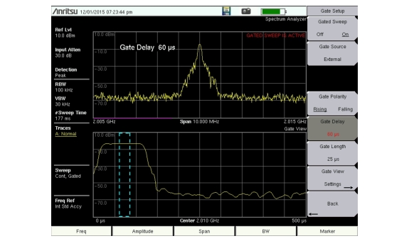 To set up the instrument for gated sweep measurements, press the Gated Sweep Setup key under the Sweep menu. The instrument screen changes to a dual graph view that makes it easier to set up the Gate Length and Gate Delay using the time domain/zero span view in the bottom graph while simultaneously viewing the signal spectrum in the top graph. The Gate Length is represented by the width of the displayed blue dashed rectangle. See Figure: Gated Sweep Example - External Gate Source. This is useful for measuring signals in the time domain such as pulsed RF, time multiplexed, or burst modulated signals.