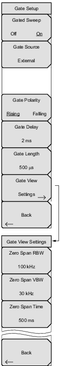 Opens the Gate View Settings menu. Allows a user to independently change the RBW, VBW and sweep time of the zero span or gate view (bottom graph).