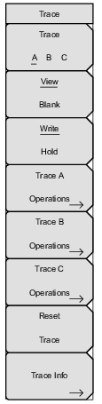 Trace A B C Sets trace A, B, or C as the active trace. Each press of this key increments through trace A, B, and C. The active trace is underlined. View/Blank Displays or hides the active trace. Write/Hold Selects between holding the current swept trace on the screen or continually sweeping and updating the displayed measurement. This is not applicable to Trace B or Trace C unless trace math involving Trace A is active. Trace A Operations Lists the Trace A Ops menu to select an operation that can be applied to Trace A. See Trace A Ops Menu. Trace B Operations: Lists the Trace B Ops menu to select an operation that can be applied to Trace B. See Trace B Ops Menu. Trace C Operations Lists the Trace C Ops menu to select an operation that can be applied to Trace C. See Trace C Ops Menu. Reset Trace Resets the trace averaging, Max Hold or Min Hold, and restarts the sweep. Trace Info Stops the current trace and displays a summary table of trace parameters and current settings. See Figure: Trace Info. Press Enter or Escape to clear the table from the display and restart the trace. Display: Press the appropriate key to display trace information for Trace A Only, Trace B Only, Trace C Only, or All Traces. Top of List: Press this submenu key to jump to the top of the Trace Info table. Page Up: Press this key to skip up through the table. Page Down: Press this key to skip down through the table. Bottom of List: Press this submenu key to jump to the bottom of the table. |