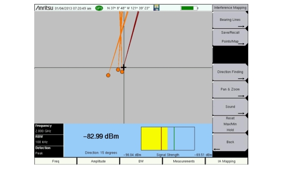 With a valid GPS signal, the instrument is able to make interference mapping measurements even when an Anritsu easyMap Tools file of the current location is not available. Location, signal strength, and bearing information can be saved in a (.kml) file. Details of each time the Save Current Bearing Location & Direction submenu key was pressed can be viewed at a later time on the instrument or in Google Earth. Refer to Mapping Save/Recall Menu for additional information on recalling saved maps and .kml data.