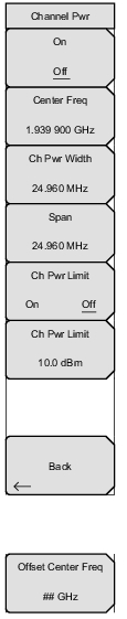 Press this key and use the arrow keys, rotary knob, or numeric keypad to enter the upper limit value for the Channel Power.