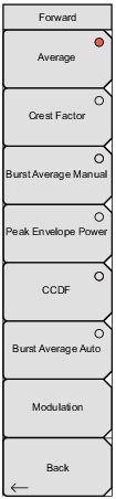 ![]() | Press the submenu key for the desired measurement parameter. Then press the Back submenu key. Average Press this submenu key to have the sensor measure the average power in the forward direction. Crest Factor Press this submenu key to have the sensor measure the Crest Factor in the forward direction. Crest Factor is a ratio of peak power to average power. Burst Average Manual Press this submenu key to have the sensor measure the average power within the signal bursts (in the forward direction). In manual, you must define the duty cycle of the bursts in order to complete the averaging calculation. Refer to the Duty Cycle submenu key in the Limits Menu. Peak Envelope Power Press this submenu key to have the sensor measure the peak power in the forward direction. CCDF Press this submenu key to have the sensor measure the value of the Complementary Cumulative Distribution Function (CCDF). A Cumulative Distribution Function (CDF) describes the probability that the signal power is less than or equal to a threshold value. The Complementary Cumulative Distribution Function (CCDF) describes the probability that the signal power is greater than a threshold value. For directions to set the threshold, refer to the CCDF Threshold submenu key in the Limits Menu. Burst Average Auto Press this submenu key to have the sensor measure the average power within the signal bursts (in the forward direction). In auto, the sensor determines the duty cycle of the bursts in order to complete the averaging calculation. Modulation Press this submenu key to select the modulation type for Peak Envelope Power (PEP) measurement only. First press the Peak Envelope Power submenu key (or check to ensure that the circle on its key face is red). Then press Modulation. The Select Modulation type list box is displayed. Use the arrow keys or the rotary knob to highlight the desired modulation type, and then press Enter to select. The selection of a specific modulation type provides a correction factor to refine the PEP calculation. Refer to Figure: Example Modulation Types for Peak Envelope Power (PEP). Back Press this submenu key to return to the Display menu. |