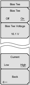 ![]() | Bias Tee Press this submenu key to toggle On and Off the variable power supply. Bias Tee Voltage Press this submenu key to set the power supply voltage. The current Bias Tee voltage selection is shown in red near the top of the graticule. Current Press this submenu key to toggle the bias tee current between Low and High. Back Press this submenu key to return to the previous menu. |