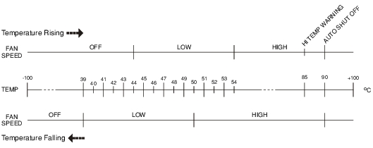 It is important to keep the fan inlet and exhaust ports clear of obstructions. The cooling fan will vary the speed in relation to the internal temperature of the instrument (refer to Figure: Fan Speed vs. Temperature). The fan will turn on at low speed when the internal temperature of the instrument reaches 44º C, and will increase the fan speed to maximum at 54º C. As the internal temperature of the instrument decreases, the fan will reduce speed until the temperature reaches 39º C, at which point the fan will turn off.