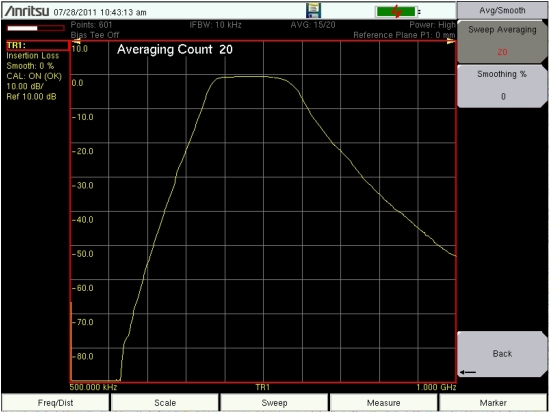 Sweep averaging can be calculated by a variable number of sweeps. In the Sweep menu, press the Avg/Smooth soft key to open the Avg/Smooth menu. In this menu, you can also set the smoothing percentage from 0 % to 20 %. To set the number of sweeps that are used to calculate sweep averaging, press the Sweep Averaging soft key and enter a number. Figure: Display Type Single – Insertion Loss with Sweep Averaging Set to 20 shows a trace with Sweep Averaging set to 20 sweeps. The example in this figure may not match the display on your instrument.