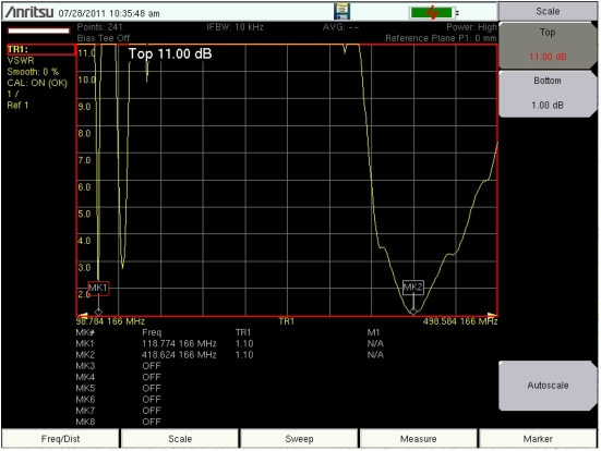 Return Loss is used to characterize RF components and systems. The Return Loss indicates how well the system is matched by taking the ratio of the reflected signal to the incident signal, measuring the reflected power in dB. The 1‑port Measurement data can also be displayed linearly as VSWR. In addition, this information can be transferred to a PC for additional analysis by using Master Software Tools.