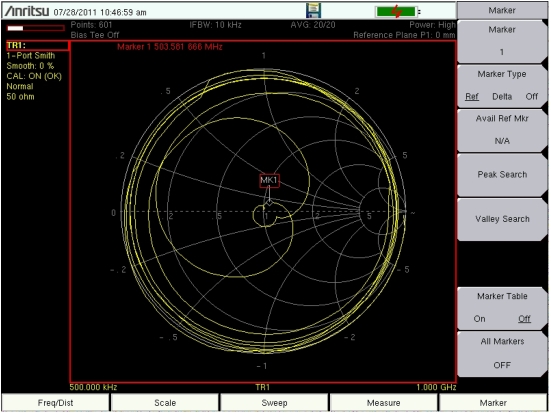 The MS20xxB VNA Master or the S412E LMR Master can display 1-port measurements in a standard Normalized 50 ohm or 75 ohm Smith Chart. When markers are used, the real and imaginary components of the Smith Chart value are displayed.