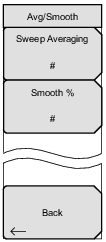 ![]() | Sweep Averaging Press this soft key to set the number of sweeps to use for averaging. The minimum number is 1. Smooth % Press this soft key to add a smoothing percentage from 0 (zero) to 20%. Use the Arrow keys, the rotary knob, or the number keypad to input the value, and then press the Enter key. Note: If you apply smoothing when the sweep has more than 2000 points, the smoothing may slow the sweep time of the trace and the responsiveness of the instrument. This slowing can be significant, and it increases as the number of sweep points is increased. Back Press this soft key to return to the Sweep menu. |