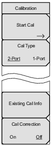 ![]() | Start Cal Press this soft key to open the “Next Step” List Box, which contains the instructions: “Connect cal component, select step, and press Enter to measure:” Cal Type 2‑Port 1‑Port Press this soft key to toggle the calibration type to 1‑Port or 2‑Port. Existing Cal Info Press this soft key to open the Existing Calibration Information List Box. Press Enter or Esc to close the list box. Cal Correction On Off Press this soft key to toggle calibration correction On and Off. |