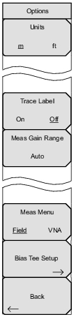![]() | Units m ft Press this soft key to select meters or feet as the displayed unit. Trace Label On Off Press this soft key to toggle trace labels On or Off. Meas Gain Range Press this soft key to open the Mode (Meas Gain Range) Menu. Then select Auto or Fixed. Meas Menu Field VNA Press this soft key to toggle the measurements to Field view or VNA view. Bias Tee Setup Press this soft key to display the Bias Tee Setup menu. All Markers OFF Press this soft key to turn OFF all markers. Back Press this soft key to return to the System menu. |