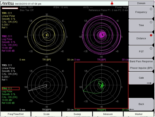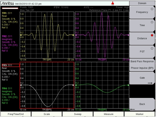 Impedance discontinuities are more difficult to analyze in the time domain with bandpass processing because the phase of the discontinuity cannot easily be extrapolated to DC. A technique called phasor impulse allows you to determine whether a mismatch is caused by a low impedance line or a high impedance line by using a special technique to “unwrap” the phase by using the peak reflection as the starting point. Phasor impulse is available in the Bandpass Mode menu. The graph in the lower‑left corner of