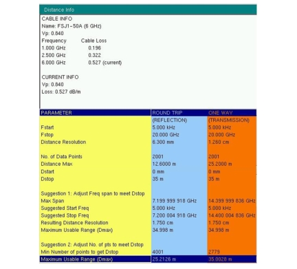 To help you with the time and distance setup, the VNA Master provides a helpful aid that provides information on the resolution and maximum range.