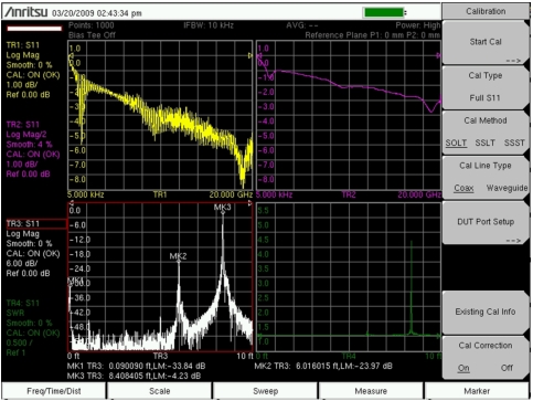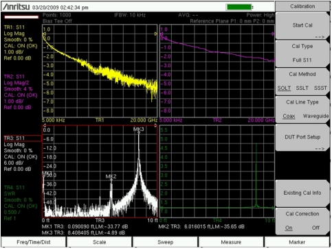 This particular cable shows (at MK2) unwanted dips (troughs) in the insertion loss frequency sweep. The optional time domain or distance‑to‑fault measurement can reveal potential causes for the poor frequency response of the cable.