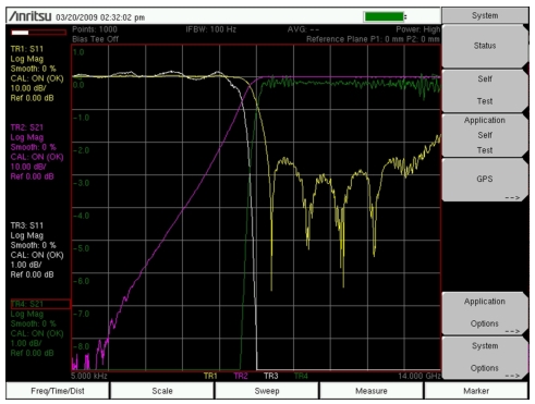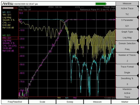 The screen‑captured measurement that is shown in Figure: High Pass Filter with 2‑Port Calibration is an overlay of S11 and S21 of a highpass filter. This measurement is comparing the transmission response calibration and the full 2-port calibration. The full 2-port calibration offers a dramatic improvement in return loss accuracy. The transmission response calibration is sufficient for a rough measurement of insertion loss.