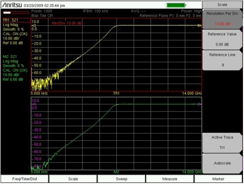 M2 and TR2 begin at the low end of the frequency range below – 60 dB and sweep upward to approximately 0 dB at mid frequency range. They continue at approximately 0 dB to the high end of the frequency range.